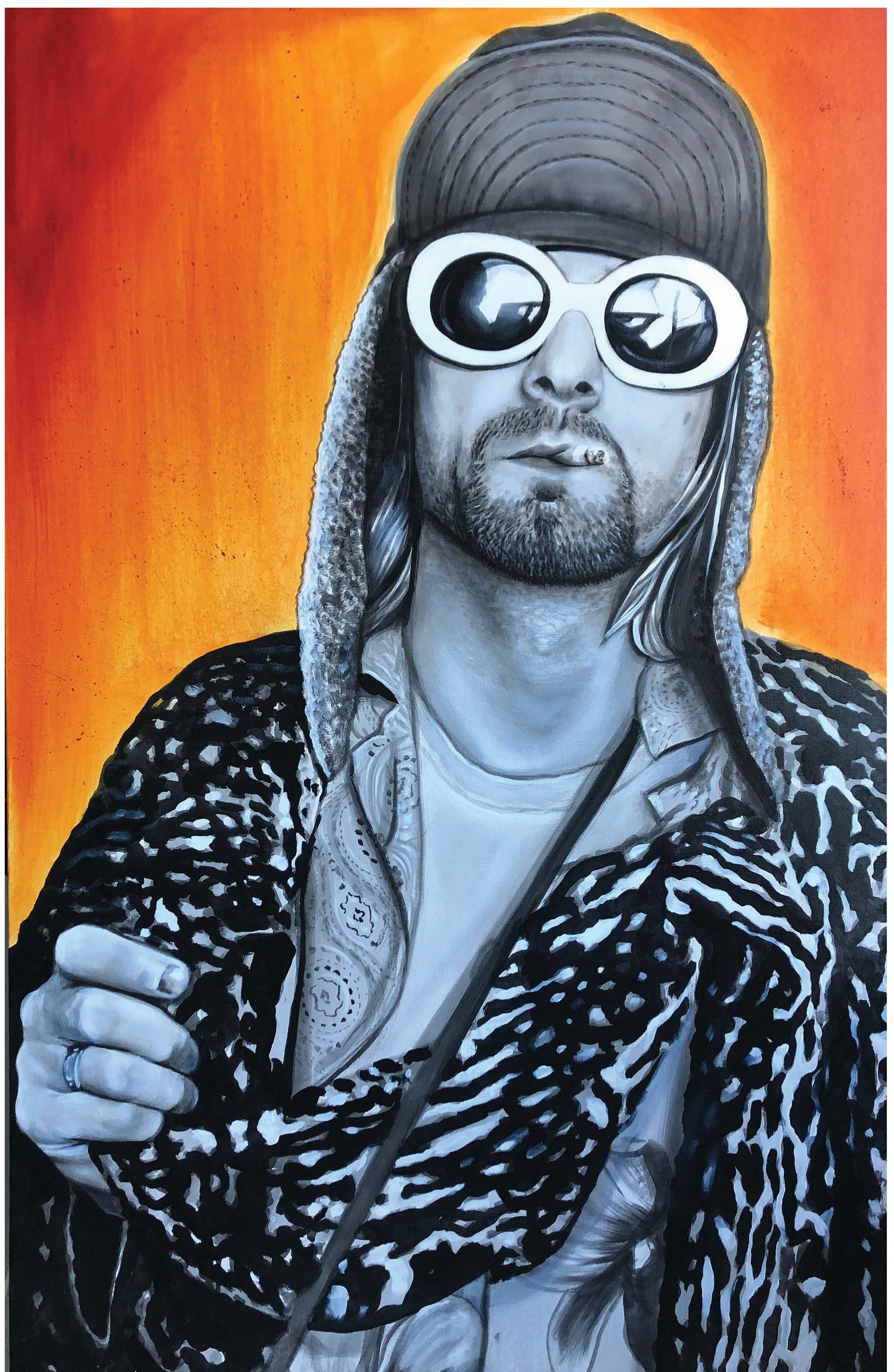 This piece of Kurt Cobain is on sale at Rockshop Fine Gems and Jewelry in downtown St. Petersburg. ( Hidden story in the reflection of his glasses. :))They showcase many of my high end celebrity ROCKstars. One of many pop icons I have painted in the couple years.